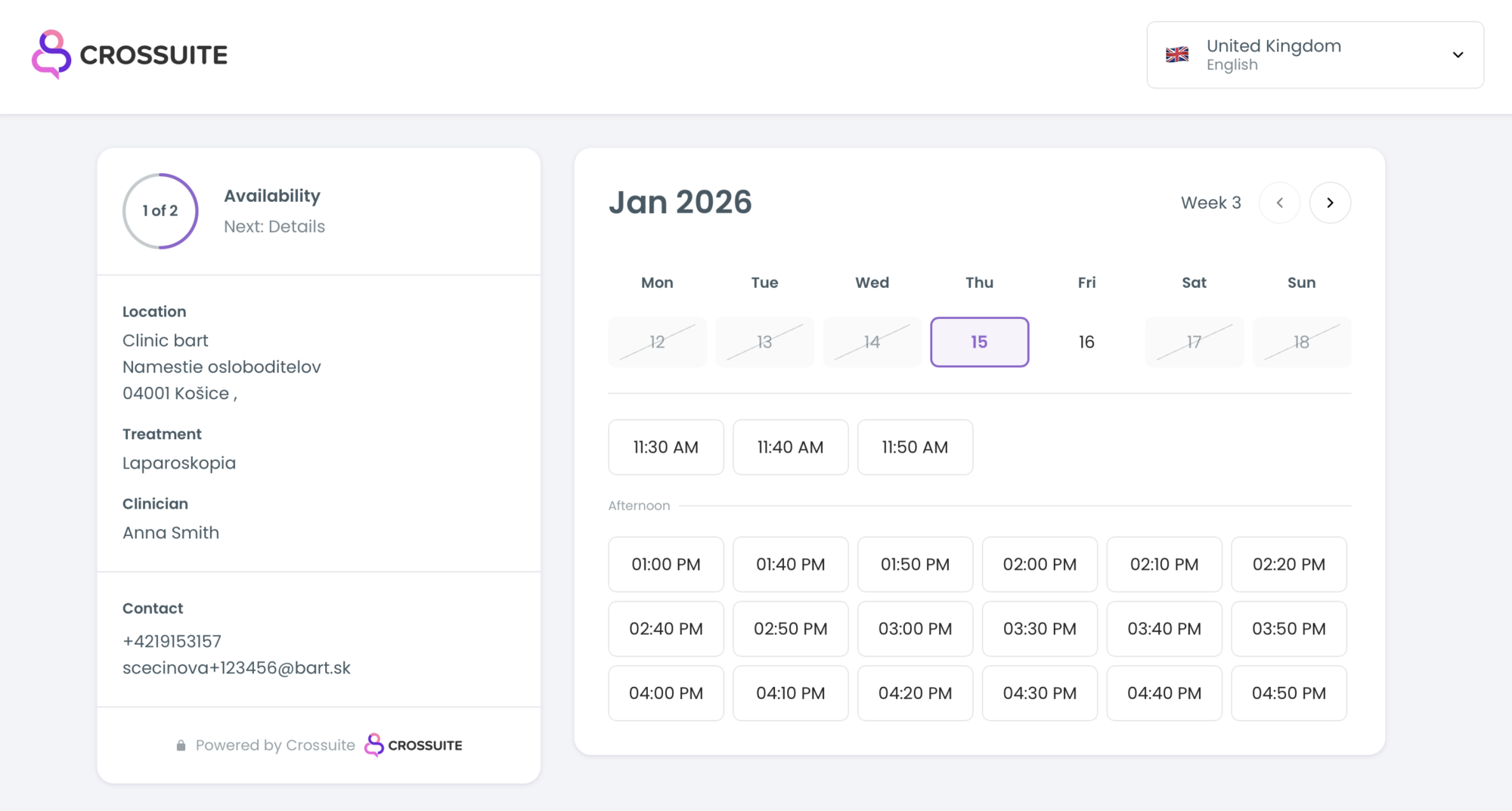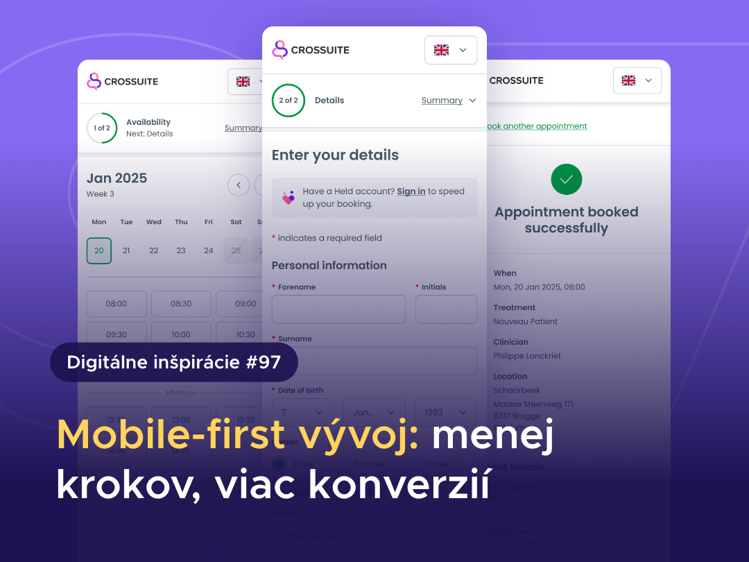 Crossuite je cloudový systém pre správu zdravotníckych zariadení, ktorý využívajú kliniky po celej Európe. Hoci rieši množstvo interných procesov, z pohľadu pacienta je často prvým (a niekedy jediným) kontaktom práve online rezervácia. Práve preto zohráva formulár na výber termínu kľúčovú úlohu v celkovej skúsenosti.